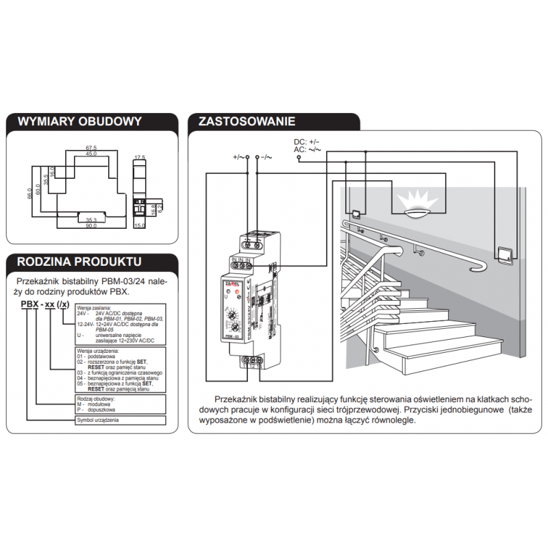 Przekaźnik bistabilny PBM-03/24V służy do sterowania oświetleniem lub dowolnym innym urządzeniem za pomocą równolegle podłączonych przycisków jednobiegunowych. Kolejne naciśnięcia dowolnego z przycisków powodują załączenie lub wyłączenie urządzeń podłączonych do zacisków wyjściowych. Impulsem sterującym może być sygnał z linii zasilającej. Po podaniu impulsu, który załączy odbiornik, a następnie odmierzeniu nastawionego czasu t następuje automatyczne wyłączenie odbiornika. Zastosowanie układu daje możliwość stworzenia “inteligentnych” systemów sterowania oświetleniem.