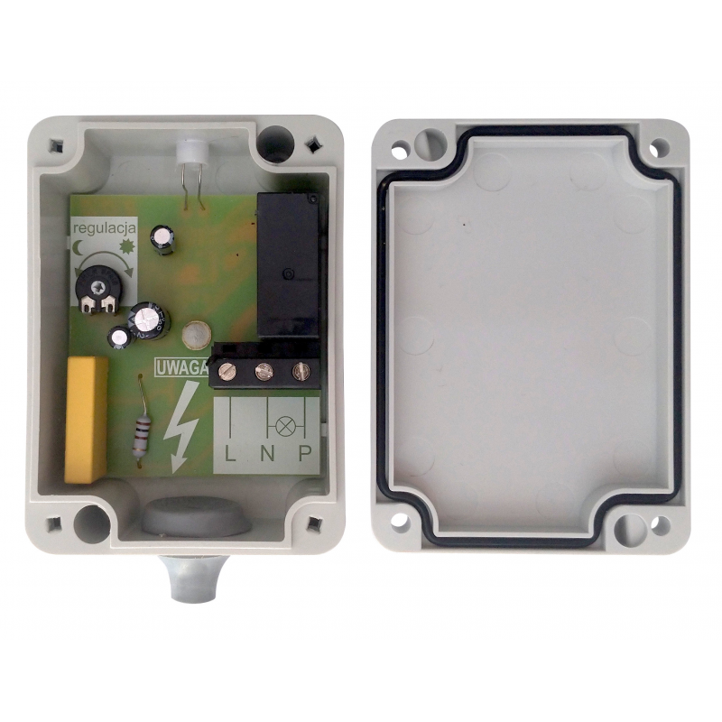 Automat zmierzchowy w tworzywowej obudowie ze specjalnym kołnierzem uszczelniającym mocowany do podłoża za pomocą dwóch wkrętów, zamykany pokrywą z uszczelką silikonową na cztery śruby.