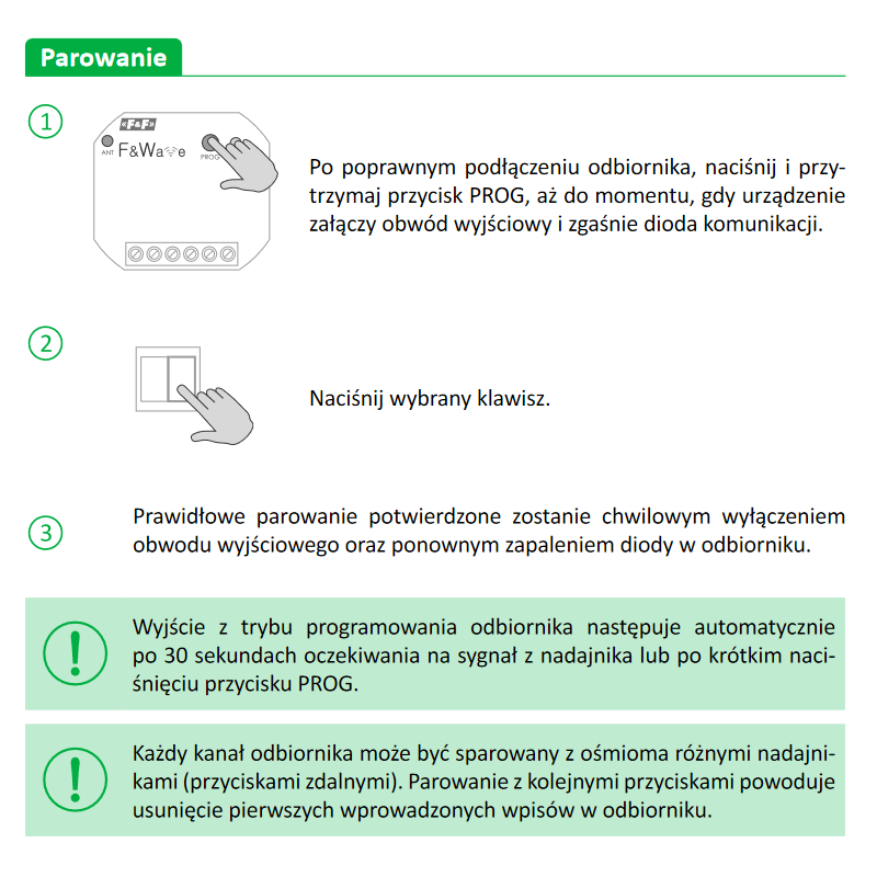 * Funkcjonalność włącz/wyłącz (przełącznik bistabilny) z odbiornikami FW-R1P, FW-R1D, FW-R2P, FW-R2D, FW-D1P, FW-D1D, FW-LED2P, FW-LED2D;