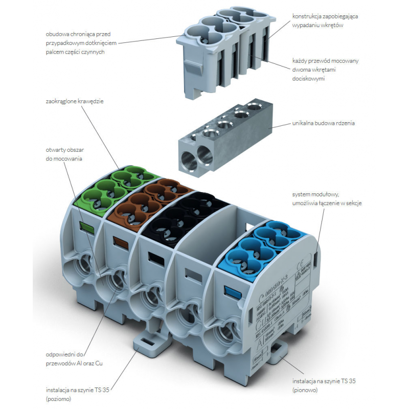 Maks. przekrój przewodów podłączeniowych35 mm² (drut), 25 mm² (linka)