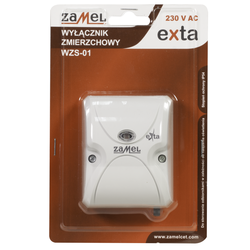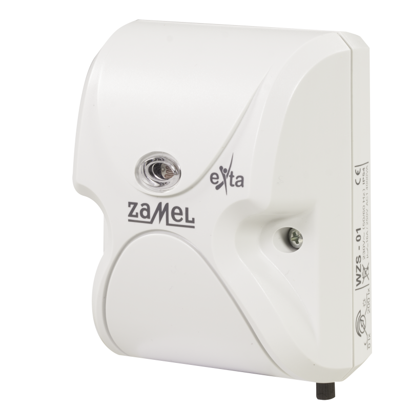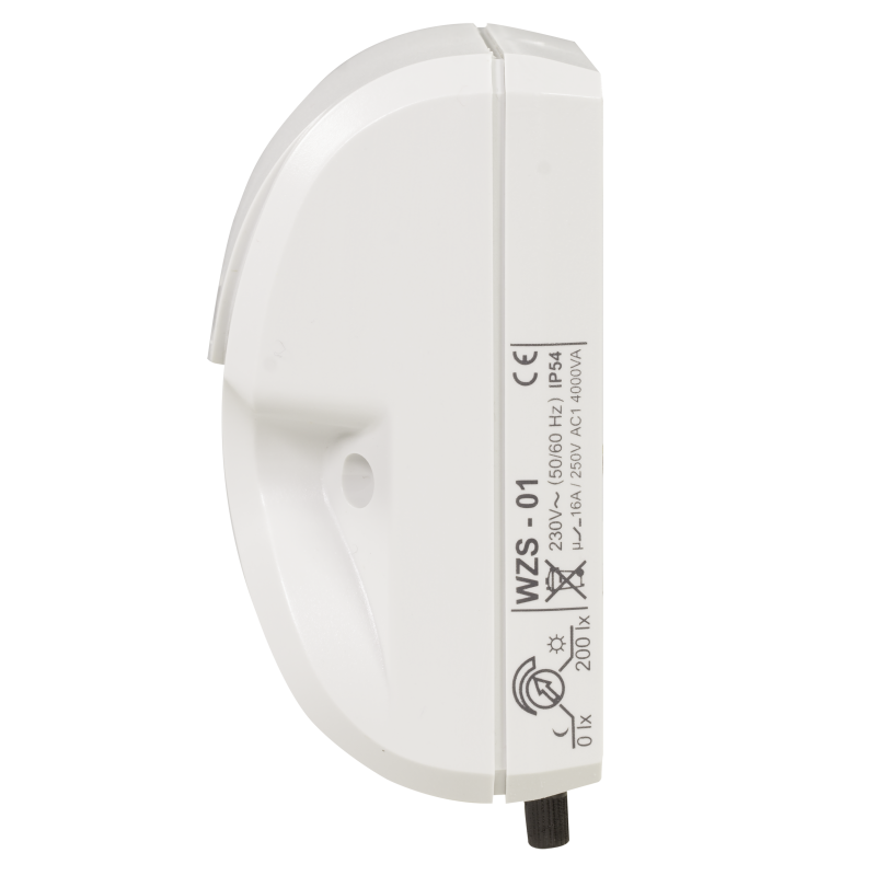 Wyłącznik zmierzchowy WZS-01 służy do sterowania urządzeniami oświetleniowymi lub innymi odbiornikami w zależności od natężenia oświetlenia. Układ załącza oświetlenie o zmierzchu i wyłącza o świcie. Próg załączenia może być płynnie nastawiony przez użytkownika i nie wymaga otwierania obudowy. Układ jest odporny na krótkotrwałe zmiany natężenia oświetlenia, co gwarantuje niezawodność pracy. Układ posiada wewnętrzny czujnik natężenia oświetlenia.