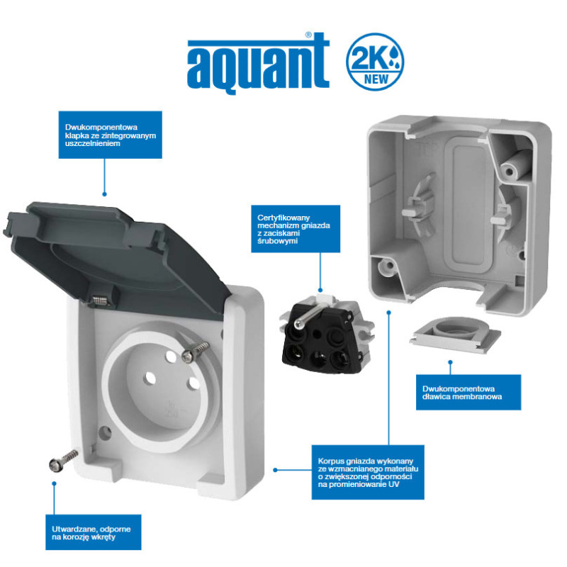 Zmodernizowana seria osprzętu natynkowego AQUANT™ to odpowiedź na potrzeby wymagających użytkowników, którzy poszukują niezawodnych rozwiązań do instalacji w miejscach o podwyższonej wilgotności, narażonych na pył, wodę oraz promieniowanie UV. AQUANT™ to aktualizacja dobrze znanej serii, teraz jeszcze bardziej dopasowana do ekstremalnych warunków pracy. Dzięki nowym cechom i zaawansowanym technologiom seria wyróżnia się jeszcze większą odpornością, funkcjonalnością i estetyką.