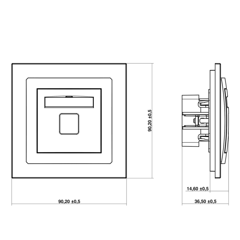 Wymiary (szer. × wys. × gł.)90,2×90,2×36,5 mm (±0,5 mm) - z ramką pojedynczą