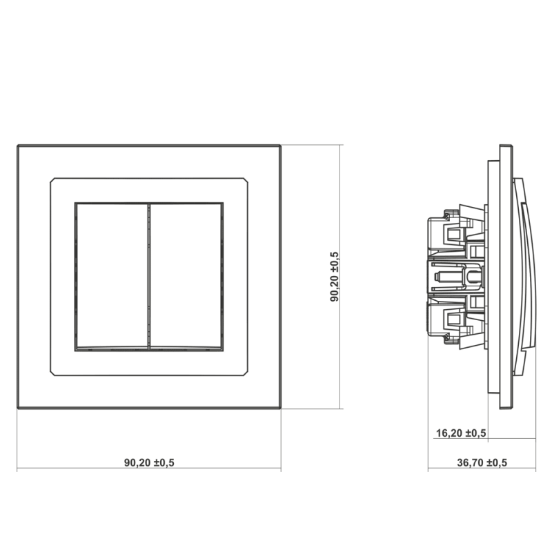 Wymiary (szer. × wys. × gł.)90,2×90,2×36,7 mm (±0,5 mm) - z ramką pojedynczą
