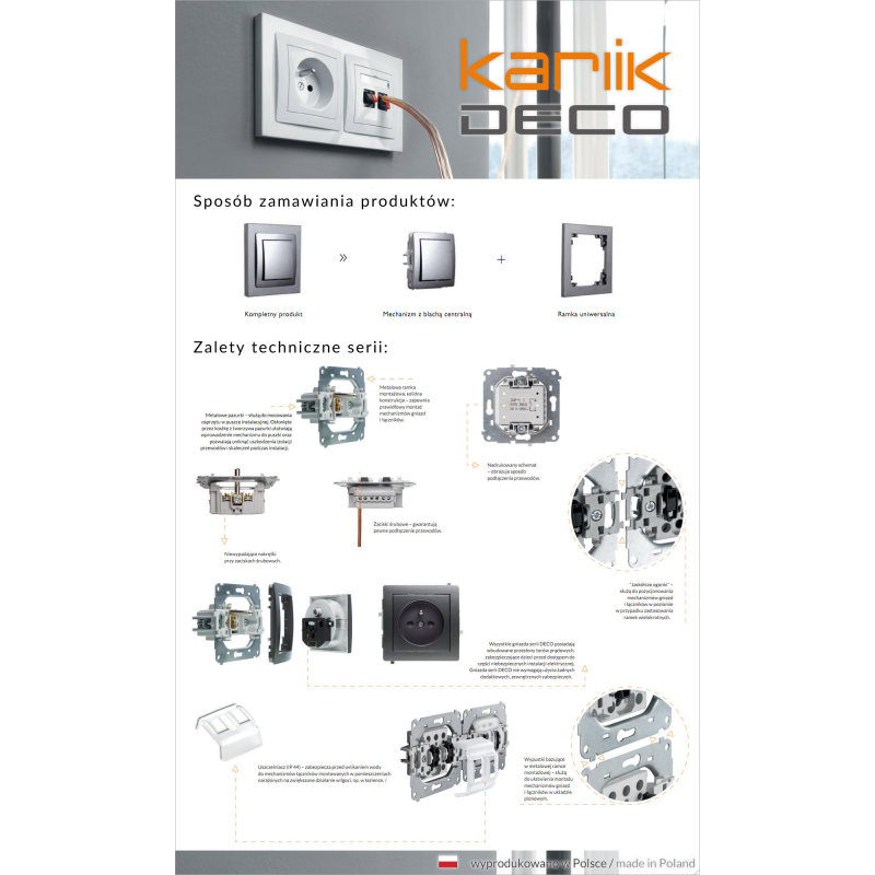 Produkt polski uznanej firmy Karlik Elektrotechnik. Produkty serii DECO są perfekcyjnym dopełnieniem nowoczesnego wnętrza. Prosta, ponadczasowa forma, jakość wykonania, niezawodny system, to tylko niektóre z zalet kolekcji gniazd i łączników. Seria posiada ramki wielokrotne, uniwersalne - do poziomego i pionowego montażu mechanizmów. W połączeniu z atrakcyjnymi wariantami kolorystycznymi, daje nieograniczone możliwości w aranżacji każdego wnętrza.