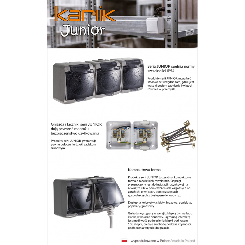 Produkt polski uznanej firmy Karlik Elektrotechnik. Produkty  serii  JUNIOR  to  zgrabna, kompaktowa  forma  o  niewielkich  rozmiarach.  Osprzęt  przeznaczony jest  do instalacji  natynkowej  na  zewnątrz  lub  w  pomieszczeniach  wilgotnych  np.  garażach  piwnicach,  pomieszczeniach gospodarczych z dostępem do wody  itp.