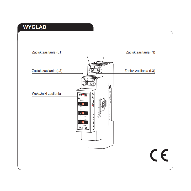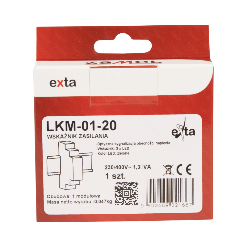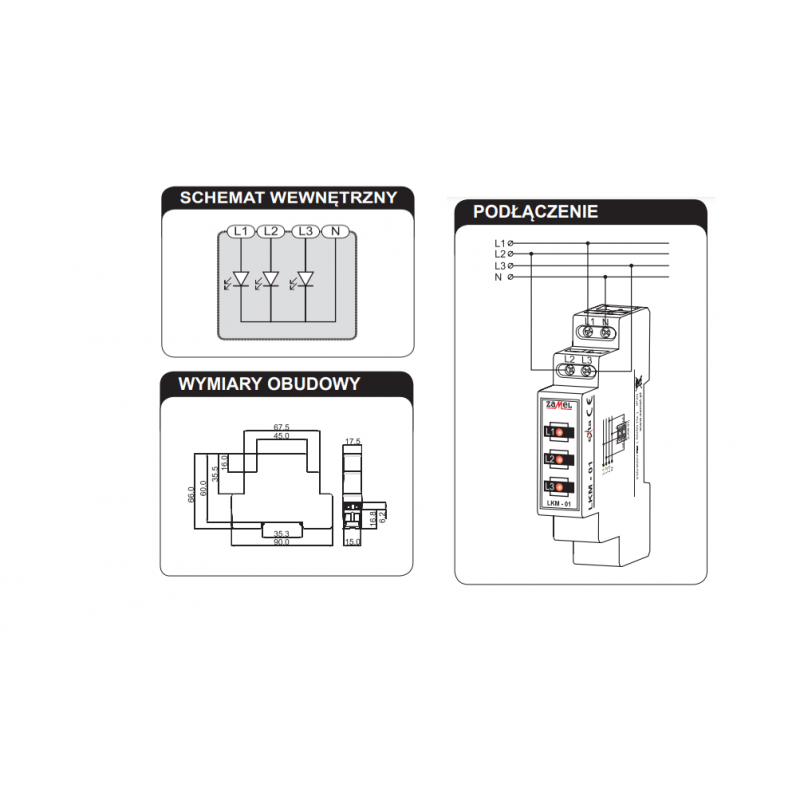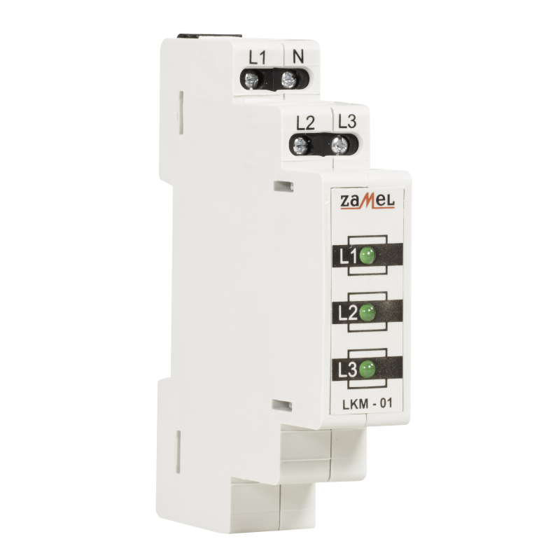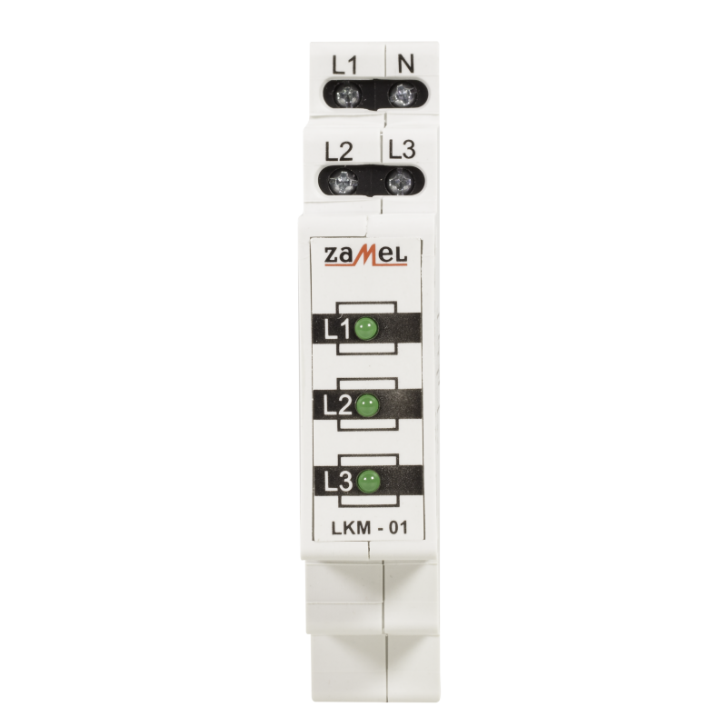 Wskaźnik zasilania LKM-01 służy do sygnalizacji napięcia w sieci trójfazowej. Sygnalizacja realizowana jest przy pomocy trzech diod LED oznaczonych L1, L2, L3. Dostępne są cztery wersje kolorystyczne diod LED (czerwona, zielona, żółta, mieszana). Wskaźnik zasilania LKM-01 może być zastosowany w sieci trójfazowej TN. (z przewodem neutralnym N).