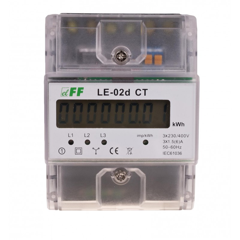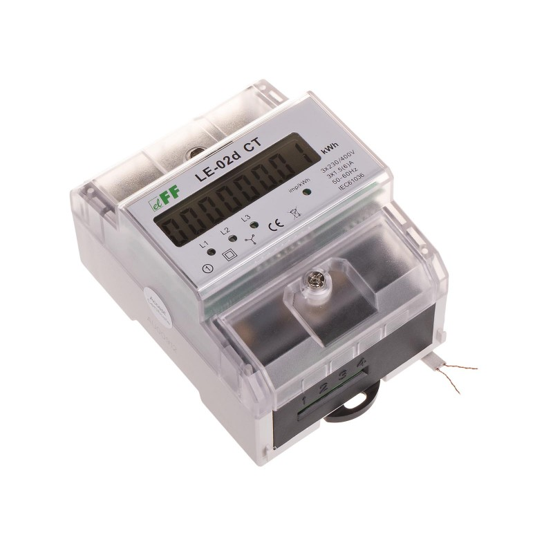 Licznik zużycia energii LE-02d CT. Trójfazowy, do pomiaru półpośredniego. Z programowalną przekładnią jest statycznym (elektronicznym) wzorcowanym wskaźnikiem energii elektrycznej prądu przemiennego trójfazowego w układzie półpośrednim.