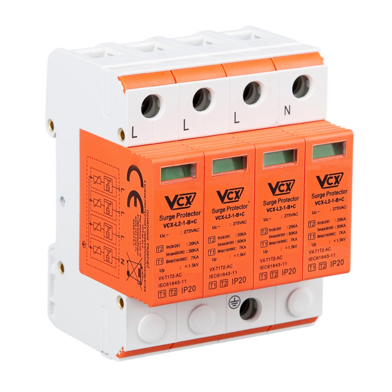 Modułowe ochronniki VCX-L2-BC klasy T1 T2. Dedykowane są do ochrony instalacji zasilających nN przed skutkami przepięć indukowanych i łączeniowych. Powinny być stosowane jako jednocześnie pierwszy i drugi stopień ochrony w tablicach piętrowych, podrozdzielniach. Ochronniki zamontowane winny być się w miejscach wprowadzeń instalacji elektrycznej do budynku. Zapewniają kompletną ochronę instalacji elektrycznej oraz zasilanych z niej urządzeń elektrycznych przed działaniem części prądu piorunowego oraz innego rodzaju przepięciami. Redukują przepięcia i sprowadzają do ziemi prądy udarowe pochodzące od obu rodzajów przepięć – bezpośrednich oraz pośrednich. Zapewniają jednocześnie dwustopniowy poziom ochrony. Stosowanie modułowych ochronników przepięć VCX-B+C klasy T1T2 nie wymaga używania dławików odsprzęgających. Zapewniają skuteczną ochronę komputerów, urządzeń RTV/AGD i itp. Wyposażone są w wizualny wskaźnik działania (zielony – ochrona, czerwony – brak ochrony).