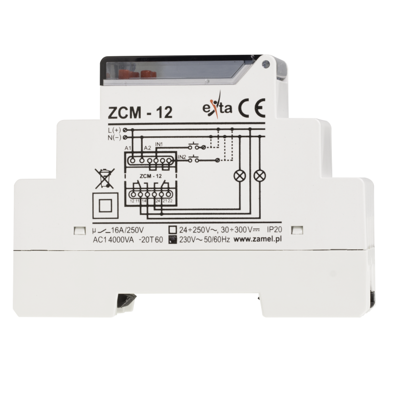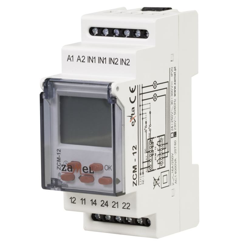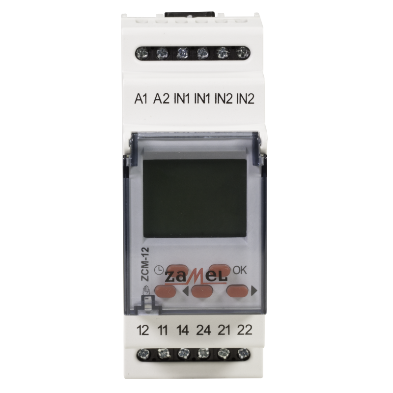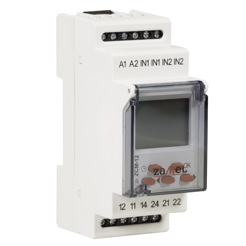 Cyfrowe zegary sterujące ZCM-12 służą do realizacji funkcji czasowych w układach automatyki i sterowania. Programatory tygodniowe realizują operacje sterowania przekaźnikiem wyjściowym w zależności od nastaw programowych (dzień, godzina). Wszystkie układy posiadają dodatkowe funkcje, m.in. funkcję losową, która może być użyta do symulacji obecności oraz funkcję wejścia sterującego, która wykorzystywana jest do zmiany trybu pracy układu za pomocą przycisku zewnętrznego. Konstrukcja obudowy umożliwia zamontowanie układu na szynie TH 35 oraz ewentualne zaplombowanie urządzenia. Konstrukcja układu gwarantuje bateryjne podtrzymanie wszelkich nastaw przy braku napięcia zasilającego.