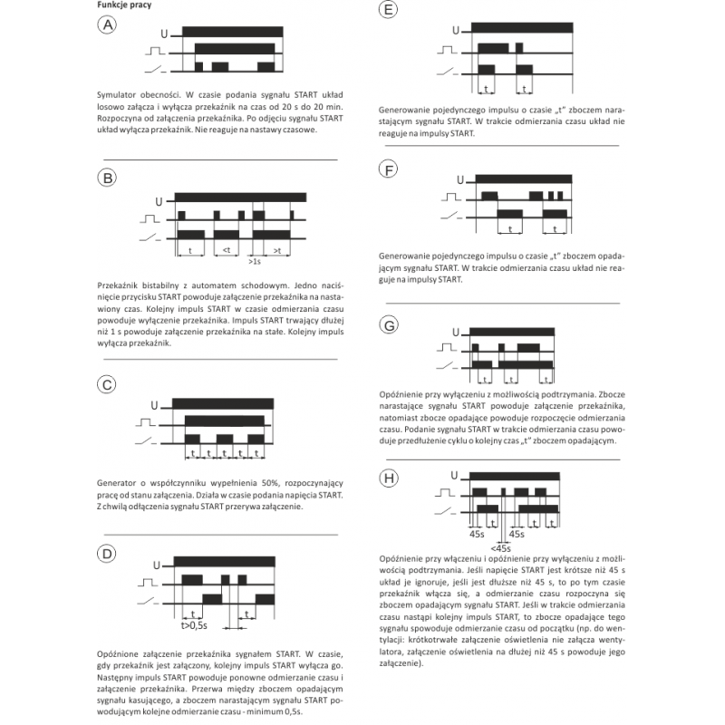 Przekaźnik realizuje wybraną funkcję pracy zgodnie z ustawionym reżimem czasowym. Wybór określonego zakresu czasowego oraz funkcji pracy przekaźnika polega na ustawieniu odpowiedniej kombinacji przełączników.
