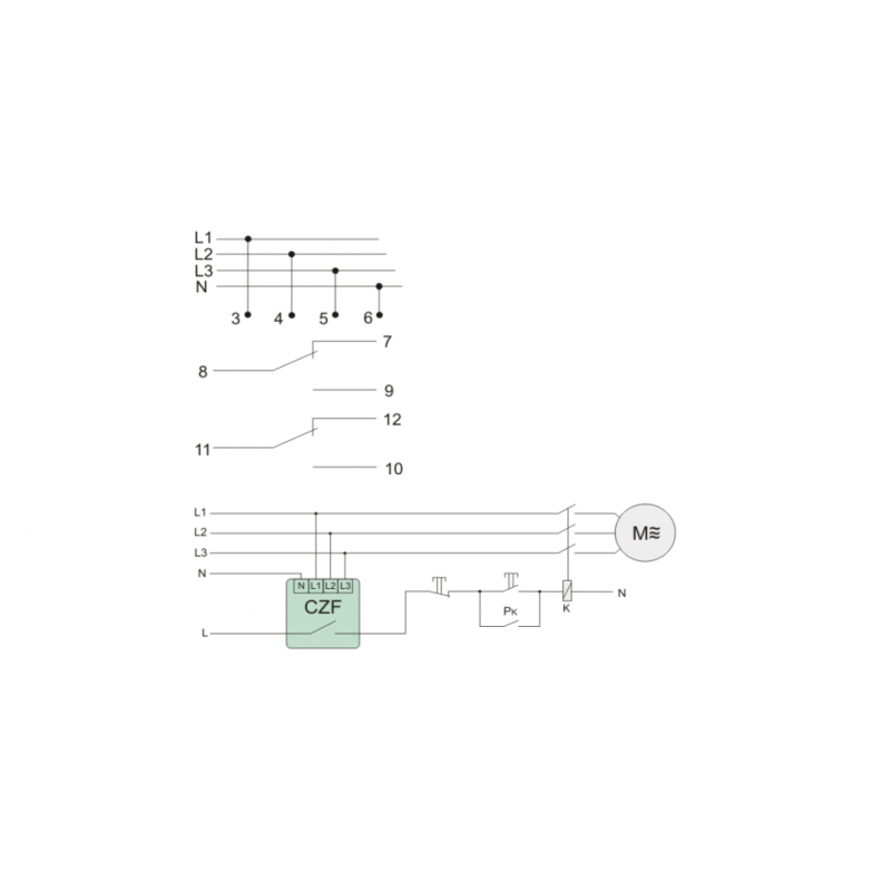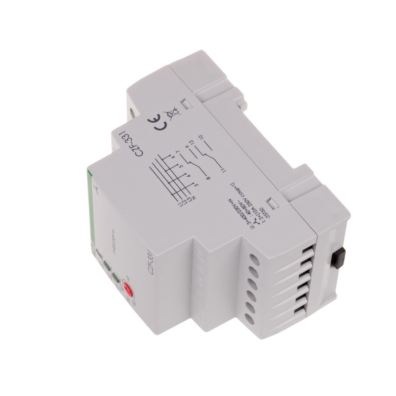 Czujnik zaniku fazy CZF-331 (z dwoma separowanymi stykami 2 x NO/NC) przeznaczony jest do zabezpieczenia silnika elektrycznego zasilanego z sieci trójfazowej w przypadkach zaniku napięcia w co najmniej jednej fazie lub asymetrii napięć między fazami, grożącymi zniszczeniem silnika.