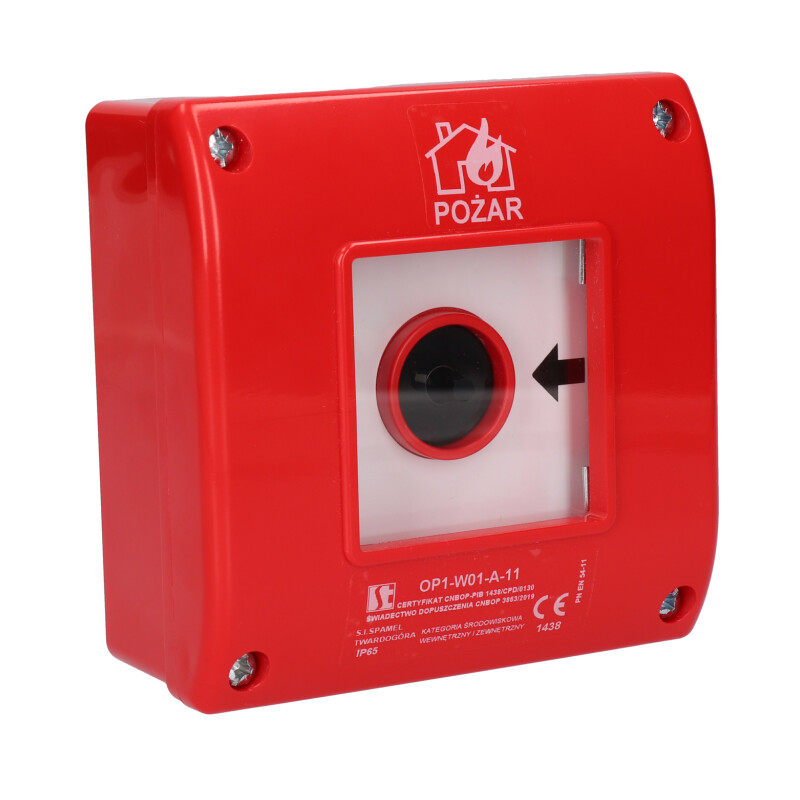 Ręczny ostrzegacz pożarowy OP1 przeznaczony jest do stosowania w pomieszczeniach przemysłowych użytku publicznego. Wykonywany jest w dwóch wersjach: podtynkowej i natynkowej. Każda z wersji oferowana jest w dwóch typach: A i B. OP1 typ A w sytuacji alarmowej wymaga tylko zbicia szybki co powoduje zwolnienie przycisku. W OP1 typ B po zbiciu szybki należy wcisnąć przycisk z samoczynnym powrotem. W każdej obudowie mogą być zainstalowane trzy łączniki SP22-10 (zwierny) lub SP22-01 (rozwierny). Dodatkowo w każdym wykonaniu może być zamontowana dioda, którą można podłączyć do łącznika lub bezpośrednio do instalacji alarmowej danego obiektu. Uruchomienie i wysłanie sygnału następuje przez zbicie szybki (typ A) lub po zbiciu szybki i wciśnięciu przycisku z samoczynnym powrotem (typ B). Kasowanie stanu alarmowego następuje przez wymianę elementu kruchego (szybki - symbol zamówienia PPOŻ-5701).