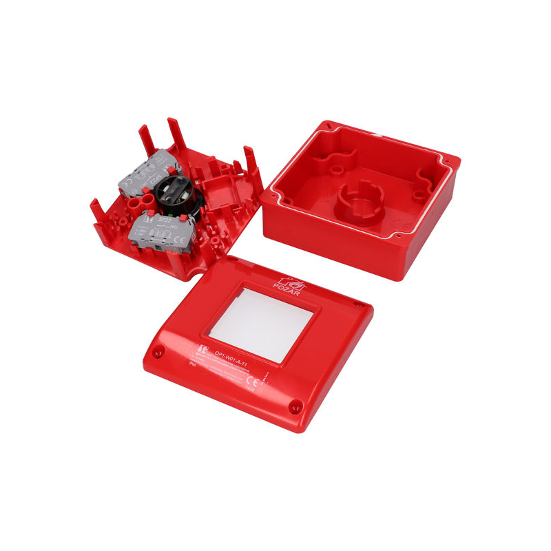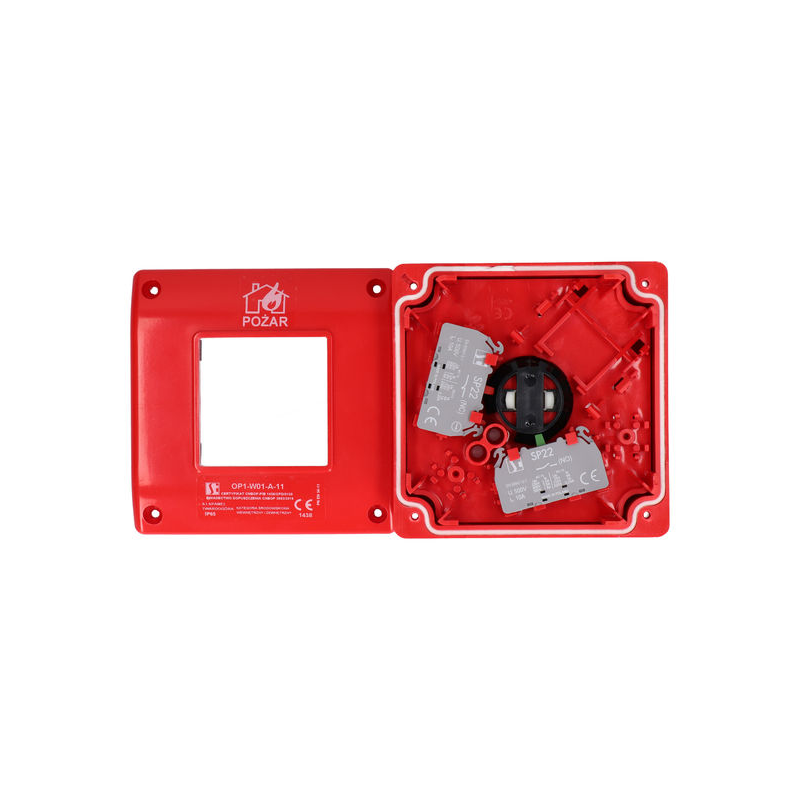 OP1-W01-A-11 wersja nadtynkowa z 1 łącznikiem zwiernym i 1 rozwiernym. Po zbiciu szybki przycisk zostaje zwolniony samoczynnie (typ A wg PN-EN 54-11)