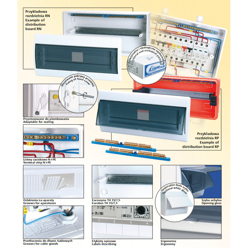 Rozdzielnice wykonane są z wysokiej jakości tworzywa sztucznego. Przystosowane są do użytkowania wewnątrz pomieszczeń. Rozdzielnice posiadają obudowę zamkniętą skrzynkową oraz przystosowane są do plombowania. W bocznych częściach obudowy posiadają przetłoczenia dla łatwego wprowadzenia przewodów bądź rurek instalacyjnych. Rozdzielnie zaopatrzone są w etykiety opisowe. Posiadają również listwy zaciskowe N+PE. Elementem montażowym w rozdzielnicy jest wspornik TH 35/7,5 (Euroszyna), pozwalający na zamontowanie zabezpieczeń nadmiarowo - prądowych, wyłączników różnicowo - prądowych oraz innych aparatów elektrycznych.