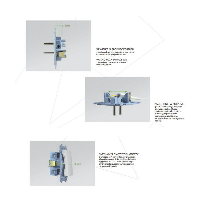 Osprzęt funkcjonuje jako system ramkowy, symetryczny (1, 2, 3, 4, 5 krotny) umożliwiający zamontowanie wyrobu w opcji poziomej i pionowej. Dzięki czterostopniowemu zatrzaskowi ramki montaż jest możliwy nawet na nierównych ścianach. Moduł instalujemy w standardowej puszce Ø60 za pomocą śrub lub pazurków.