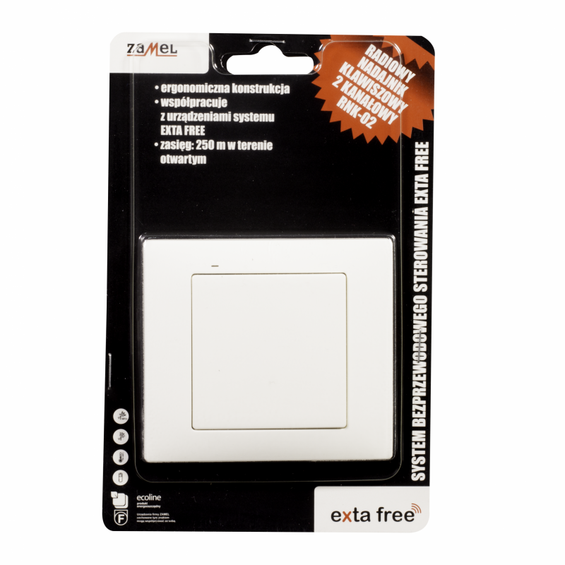 Radiowy nadajnik klawiszowy RNK-02 jest urządzeniem nadawczym bezprzewodowego systemu sterowania EXTA FREE, przeznaczonym do realizacji funkcji sterowania takich jak: załączenie/wyłączenie, rozjaśnianie/ściemnianie, podnoszenie/opuszczanie rolet, tryb pracy czasowej. Dzięki niewielkim rozmiarom i wadze oraz braku konieczności podłączania zasilania zewnętrznego, może być montowany na dowolnej powierzchni, w tym na szkle, drewnie, itd.