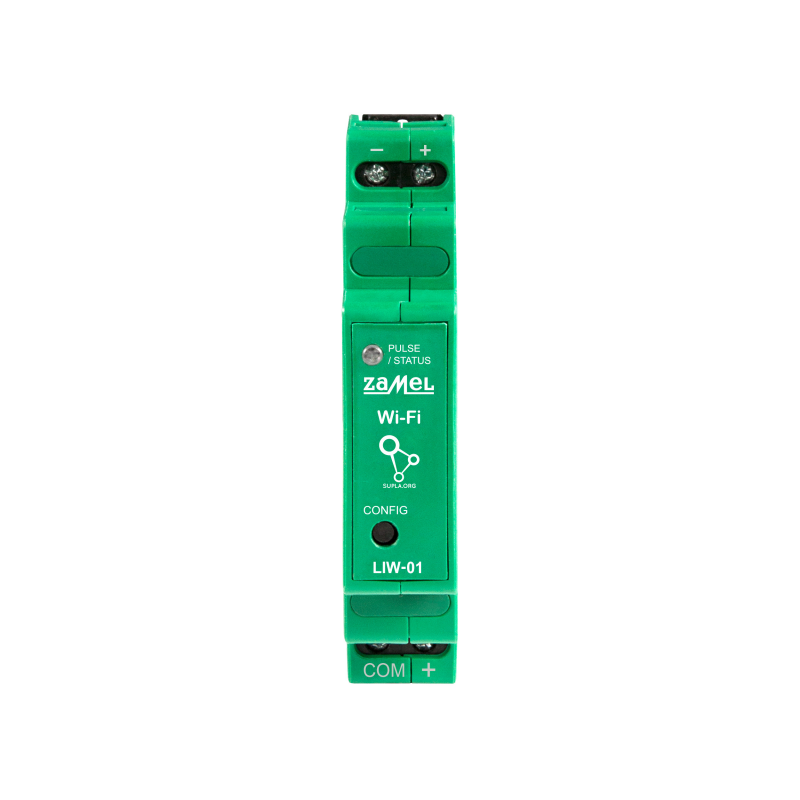 Licznik impulsów LIW-01 jest urządzeniem umożliwiającym zliczanie impulsów elektrycznych. Pozwala na pomiar zużycia z liczników energii, wody oraz gazu. Urządzenie LIW-01 zlicza impulsy z wyjść lub nakładek impulsowych w licznikach. Montowany jest w prosty sposób w rozdzielni elektrycznej na szynie TH35 (DIN). Dzięki niedużym rozmiarom zajmuje szerokość tylko jednego modułu. Licznik impulsów LIW-01 jest urządzeniem zasilanym z napięcia 12-24 V AC/DC. Dane pomiarowe magazynowane są po stronie chmury Supla, z której mamy później możliwość ich pobrania. Urządzenie należy podłączyć zgodnie z obowiązującymi normami i przepisami. Sposób podłączenia określono w instrukcji obsługi. Czynności związane z: instalacją, podłączeniem i regulacją powinny być wykonywane przez osobę posiadającą odpowiednie kwalifikacje, która zapoznała się z instrukcją obsługi i funkcjami urządzenia.