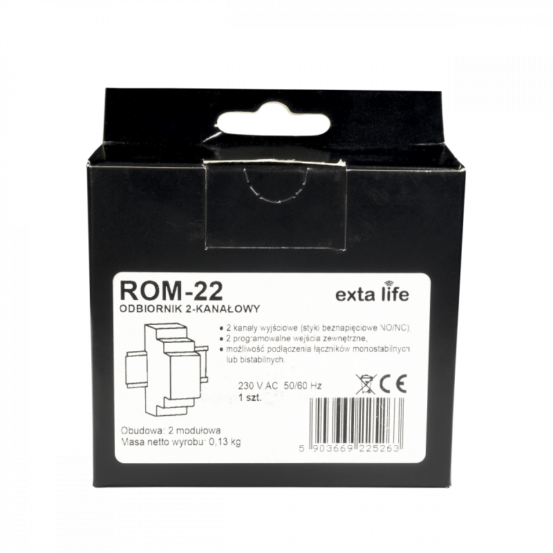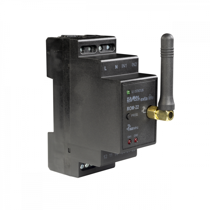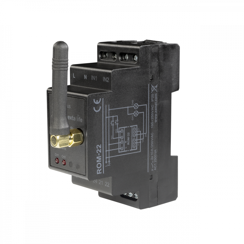 Radiowy odbiornik modułowy ROM-22 to element końcowy systemu EXTA LIFE, który umożliwia niezależne sterowanie dwoma dowolnymi urządzeniami / obwodami. Wyjścia stanowią dwa przekaźniki ze stykami przełącznymi (NO/NC) o maksymalnej obciążalności 10A. Daje to możliwość sterowania obwodami niskonapięciowymi (na przykład 12/24 V AC/ DC) oraz wysokonapięciowymi (230 V AC). Odbiornik sprawdza się także przy zdalnym wyzwalaniu innych urządzeń. Z powodzeniem można go wykorzystać przy podawaniu sygnałów sterujących. ROM-22 nadaje się także do sterowania elektrozaworami w systemach ogrzewania. Komunikacja dwukierunkowa pomiędzy odbiornikiem a kontrolerem sprawia, iż aktualny stan każdego kanału odbiornika jest wskazywany w aplikacji mobilnej. Dzięki komunikacji dwukierunkowej możliwa jest także zmiana wybranych parametrów odbiornika oraz zdalne dopisywanie nadajników (bez dostępu do odbiornika). Algorytm kodowania ramek zapewnia bezpieczeństwo sterowania. Odbiornik poza kontrolerem może być równolegle sterowany z poziomu nadajników systemu EXTA LIFE. Do odbiornika można wpisać większą liczbę nadajników co daje możliwość niezależnego sterowania z kilku miejsc. Konfigurowalne wejścia przewodowe zwiększają funkcjonalność sterowania. Odbiornik posiada zaimplementowaną funkcję zdalnej aktualizacji oprogramowania z poziomu kontrolera. Urządzenie przeznaczone jest do montażu w szafach rozdzielczych na szynie TH35 (DIN). Odkręcana antena umożliwia dołączenie anteny zewnętrznej.