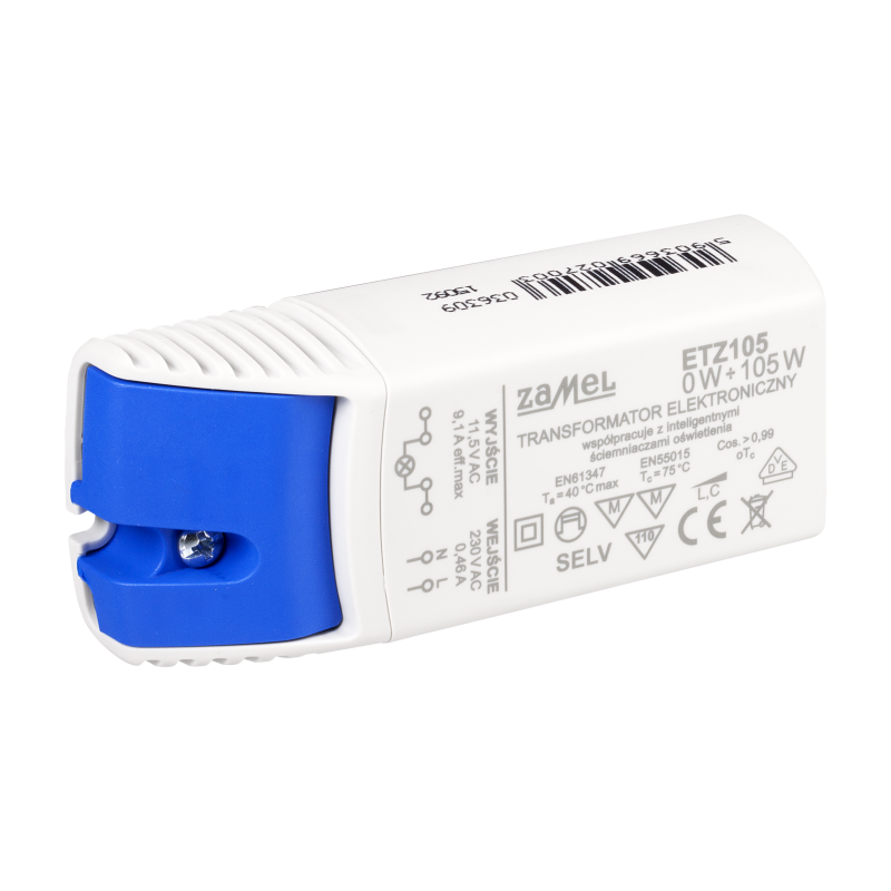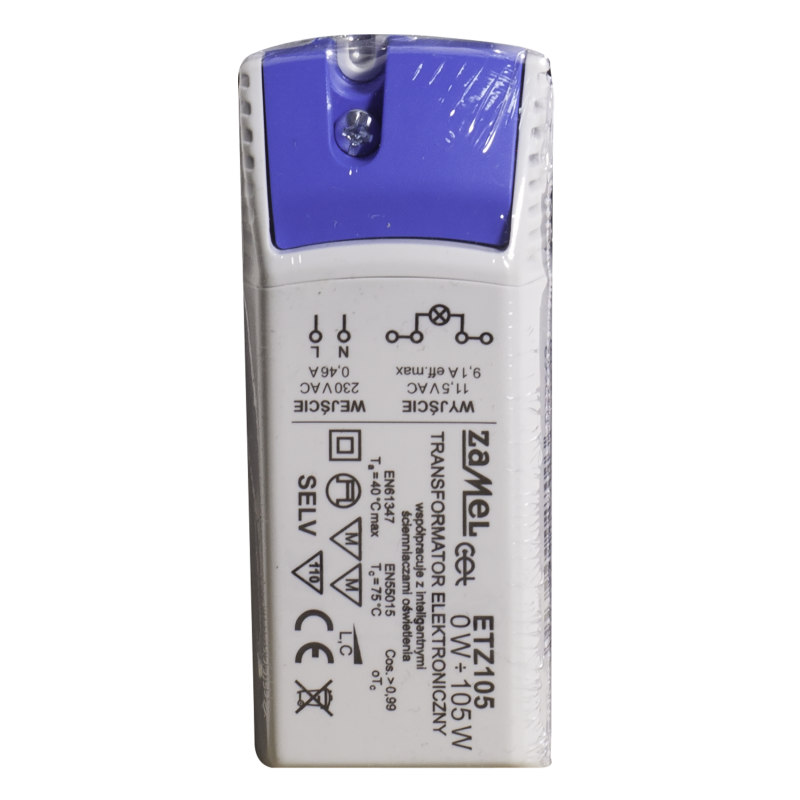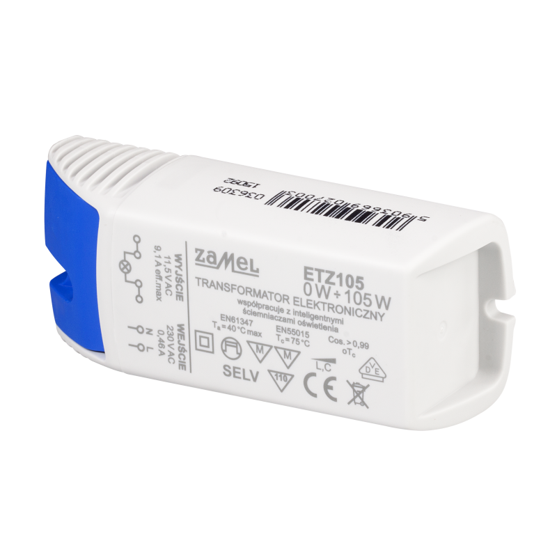 Transformator ETZ105 o mocy wyjściowej 105 W, przeznaczony jest do współpracy z halogenowymi źródłami światła, zasilanymi napięciem 12 V AC. Cechą charakterystyczną transformatora jest możliwość zasilania bardzo małych obciążeń od 0 W. Urządzenie posiada szereg zabezpieczeń (zwarciowe, przeciążeniowe, termiczne) oraz opatentowanych rozwiązań, które zwiększają żywotność żarówek halogenowych współpracujących z transformatorami, oraz poprawiają bezpieczeństwo użytkowania samych urządzeń. ETZ105 przeznaczony jest do montażu natynkowego. Podłączenia dokonuje się za pomocą złącz śrubowych. Transformator może współpracować z inteligentnymi typami ściemniaczy oświetlenia.