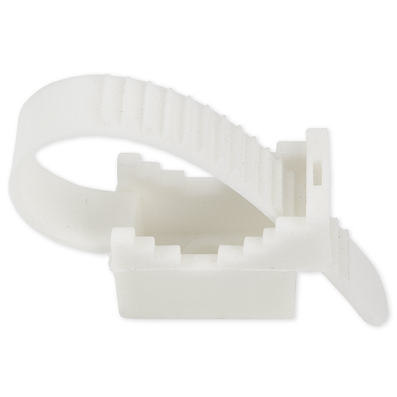 Uchwyt paskowy. Produkt służy do mocowania przewodów elektrycznych, telekomunikacyjnych, sterowniczych oraz wszelkiego rodzaju rur instalacyjnych, wykonanych z metalu bądź tworzywa sztucznego (PVC, PESCHEL, CU). Stosowany najcześciej wewnątrz budynków. Składa się paska o ząbkowanym profilu oraz siodełka mocującego. Posiada mechanizm zwalniający pasek, umożliwiający regulację instalacji. Zapewnia stabilny montaż. A wykonanie produktu z polipropylenu, wysokiej jakości tworzywa sztucznego, eliminuje ryzyko uszkodzenia.