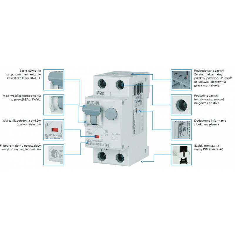 Nowa seria produktów xPole Home, obejmująca całą gamę wyłączników nadprądowych HN, kombinowanych HNB i różnicowoprądowych HNC, została opracowana z myślą o maksymalnym bezpieczeństwie i efektywności projektowania. Serię tę cechuje uproszczone wzornictwo, niezawodność i pełna zgodność z odpowiednimi normami. Ponadto urządzenia z serii xPole Home są łatwo dostępne i proste w montażu. Wyłączniki nadprądowe xPole Home do zastosowań domowych łatwo rozpoznać po szarym piktogramie domu zamieszczonym na każdym produkcie z tej serii oznaczającym zwiększone bezpieczeństwo. Uproszczone wzornictwo, a zarazem odporność i wytrzymałość na agresywne środowisko to główne zalety produktów EATON. Wszystkie wyłączniki z serii xPole Home mają szeroką gamę sprawdzonych funkcji, które dodatkowo zwiększają bezpieczeństwo pracy i łatwość obsługi. Nowa aparatura modułowa EATON może być wyposażona w akcesoria: styki pomocnicze, wyzwalacz wzrostowy, wyzwalacz podnapięciowy, aparat do ponownego załączenia, szyny łączeniowe, blokadę na kłódkę.