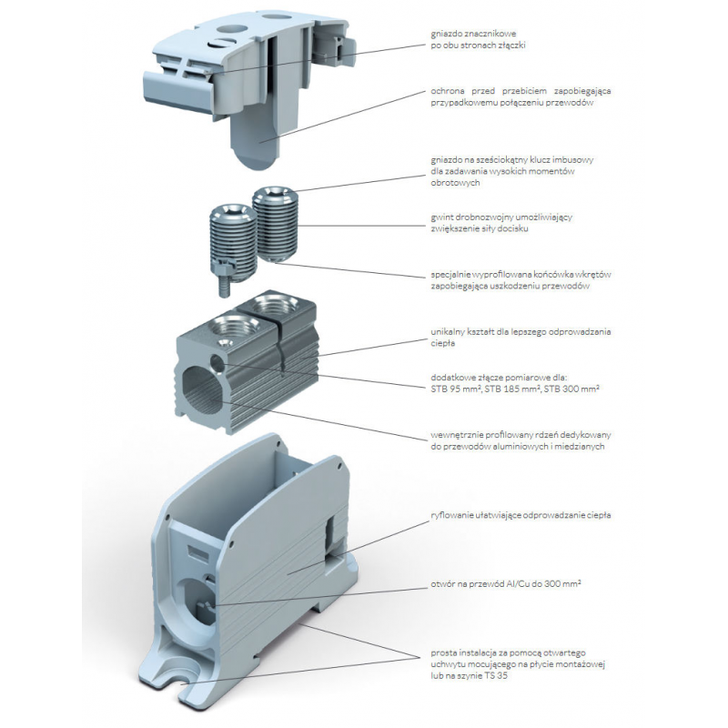 Złącza serii STB są wyposażone w zabezpieczenie przed przebiciem prądu, zapobiegające stykaniu się przewodów w środku i ewentualnemu utlenianiu. Śruby posiadają sześciokątne łby, co pozwala na uzyskanie wysokiego momentu obrotowego podczas montażu za pomocą klucza imbusowego, natomiast odpowiednio obrobione końcówki śrub zapobiegają uszkodzeniu miękkich przewodów aluminiowych podczas instalacji. Zacisk i plastikowa obudowa zostały zaprojektowane w sposób zapewniający skuteczne odprowadzanie ciepła podczas użytkowania.