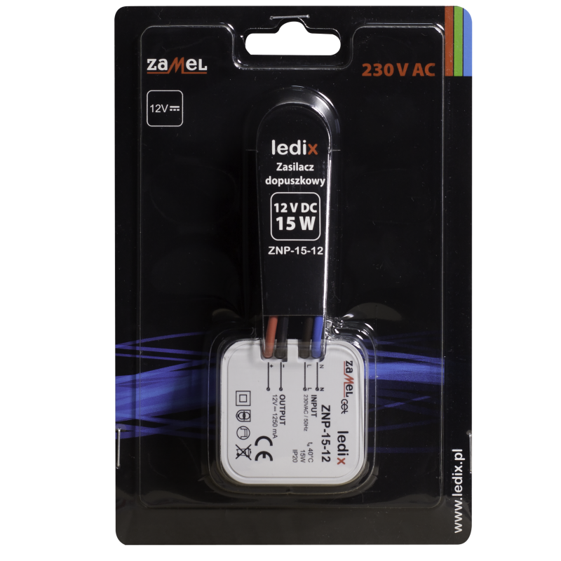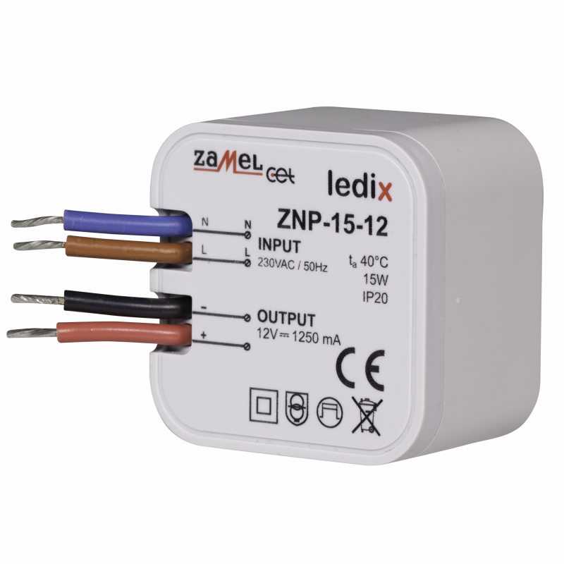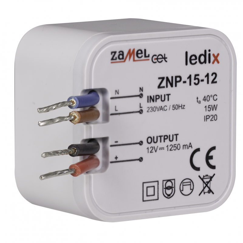 Zasilacz ZNP-15-12 to profesjonalny zasilacz impulsowy o napięciu wyjściowym 12 V DC i mocy znamionowej 15 W. Zasilacz przeznaczony jest do współpracy z produktami LEDIX takimi jak sterowniki i odbiorniki radiowe oraz innymi produktami LED zasilanymi napięciem o wartości 12 V DC. Przeznaczony jest do bezpośredniego montażu w puszce instalacyjnej fi60. Produkt posiada zabezpieczenia przeciwzwarciowe oraz przeciążeniowe, które zwiększają bezpieczeństwo jego użytkowania. Wysoka sprawność oraz bardzo mały pobór mocy w trybie czuwania sprawiają, iż jest to rozwiązanie bardzo ekonomiczne, przeznaczone do pracy ciągłej. Zasilacz spełnia wymagania norm zharmonizowanych.
