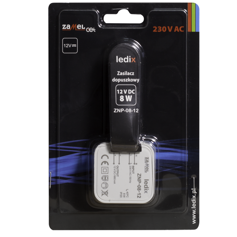 Zasilacz ZNP-08-12 to profesjonalny zasilacz impulsowy o napięciu wyjściowym 12 V DC i mocy znamionowej 8 W. Zasilacz przeznaczony jest do współpracy z produktami LEDIX takimi jak sterowniki i odbiorniki radiowe oraz innymi produktami LED zasilanymi napięciem o wartości 12 V DC. Przeznaczony jest do bezpośredniego montażu w puszce instalacyjnej. Produkt posiada zabezpieczenia przeciwzwarciowe oraz przeciążeniowe, które zwiększają bezpieczeństwo jego użytkowania. Wysoka sprawność oraz bardzo mały pobór mocy w trybie czuwania sprawiają, iż jest to rozwiązanie bardzo ekonomiczne, przeznaczone do pracy ciągłej. Zasilacz spełnia wymagania norm zharmonizowanych.