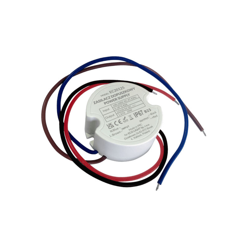 Wysokowydajny, charakteryzujący się stabilną pracą zasilacz do produktów LED o napięciu 12V pasujący do standardowej puszki fi60. Zasilacz jest jest wodoodporny, obudowa z tworzywa sztucznego.